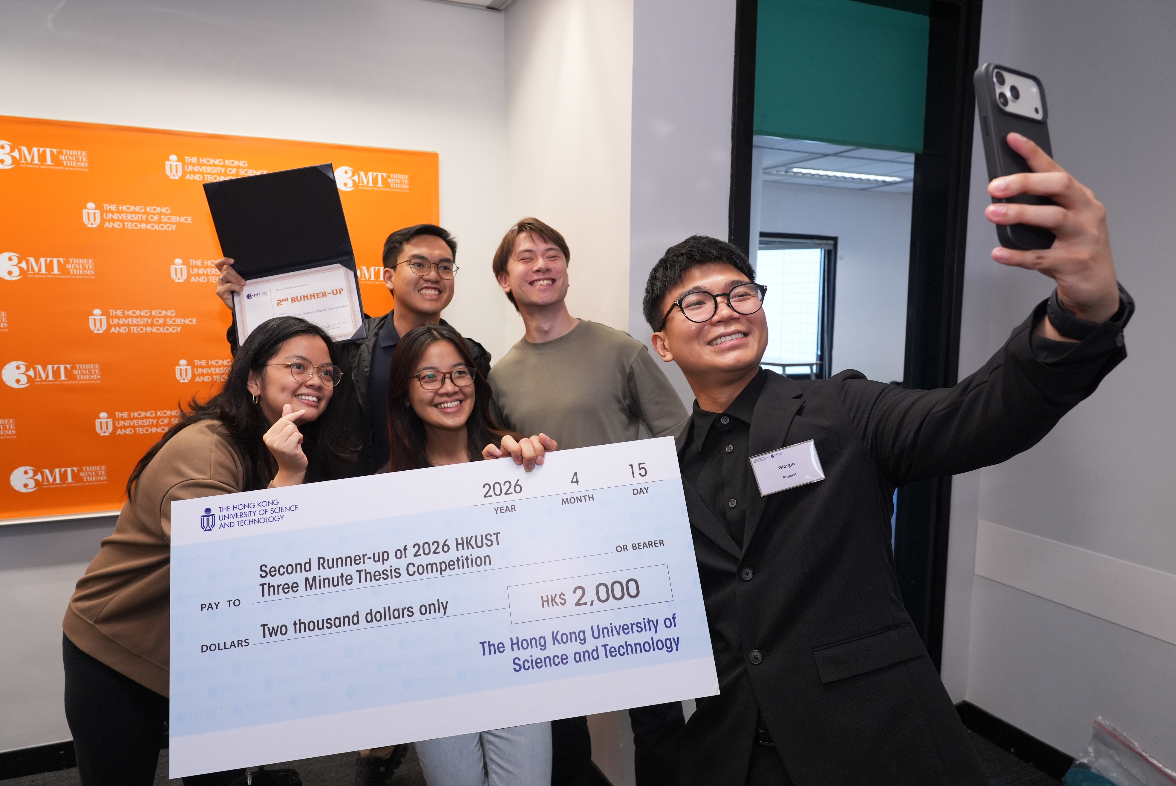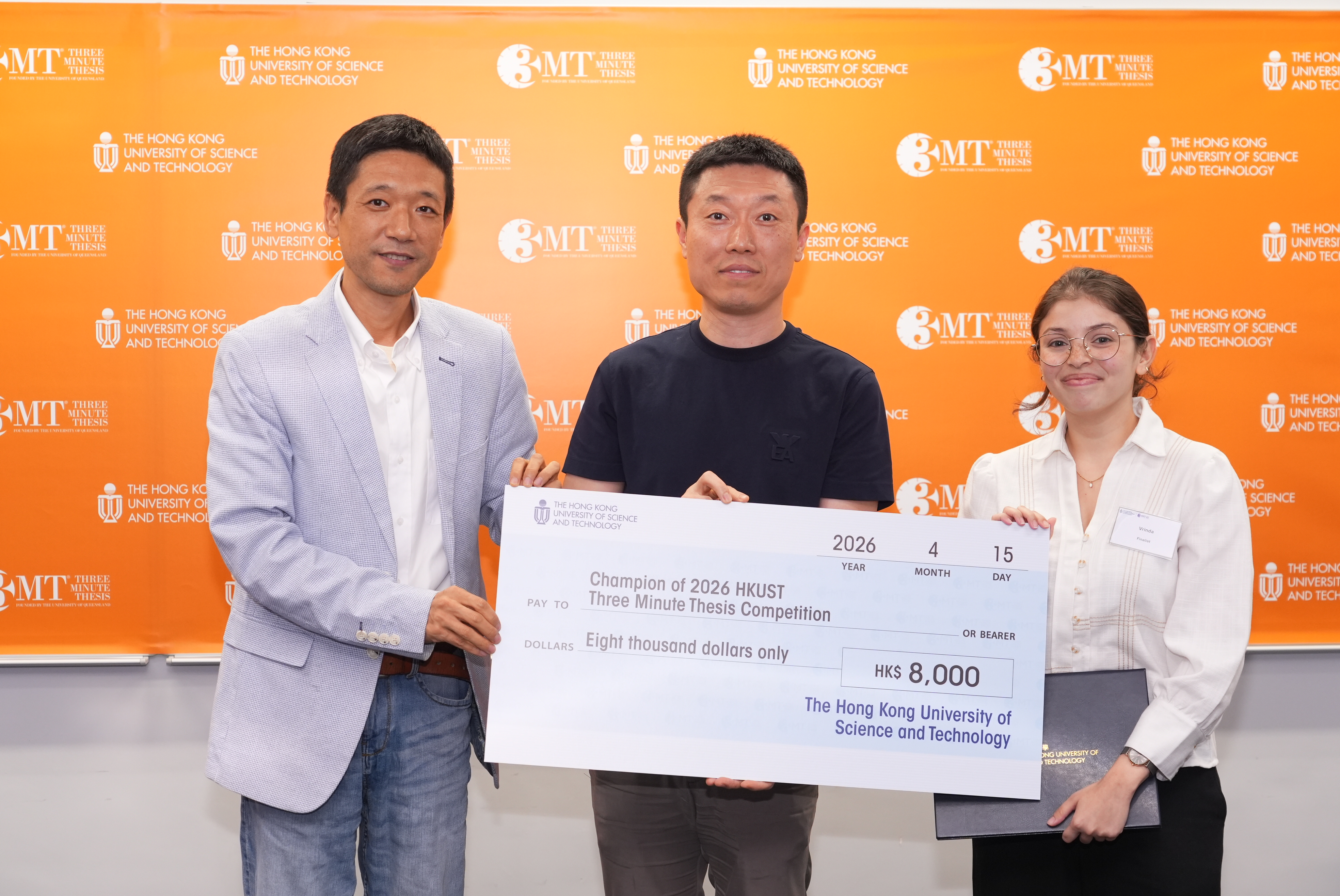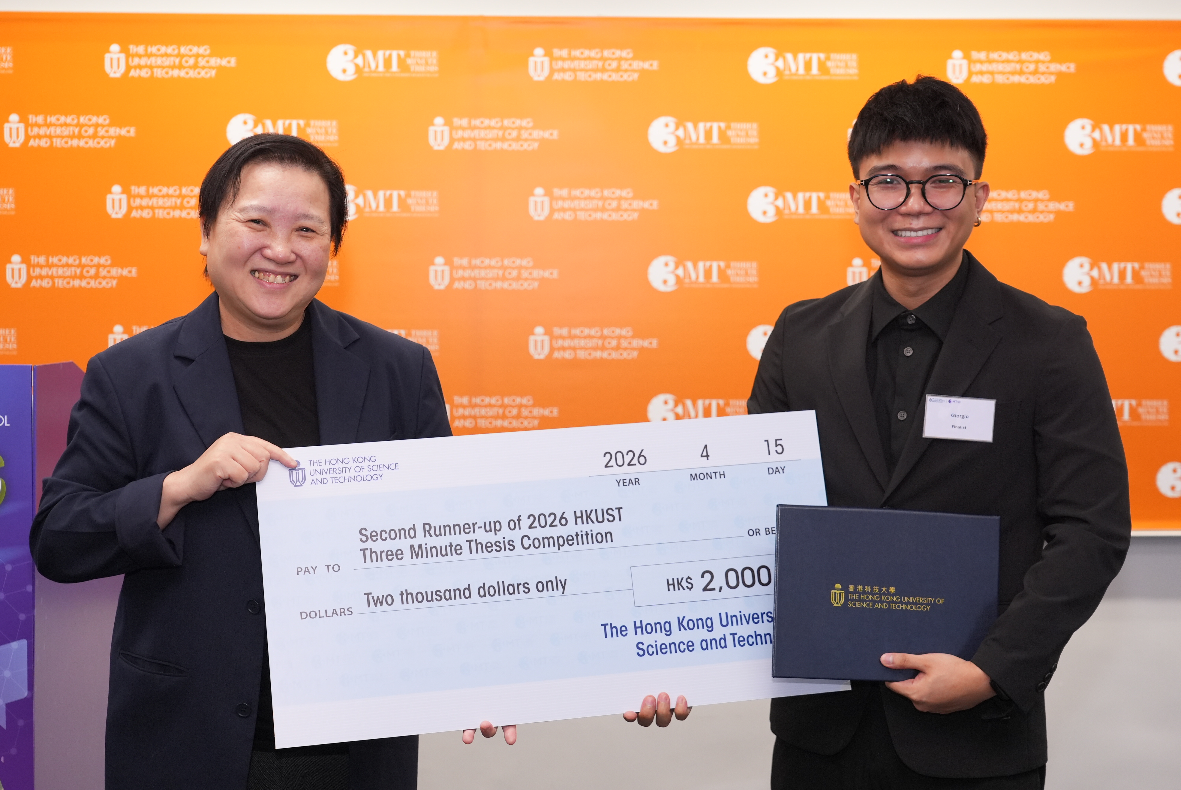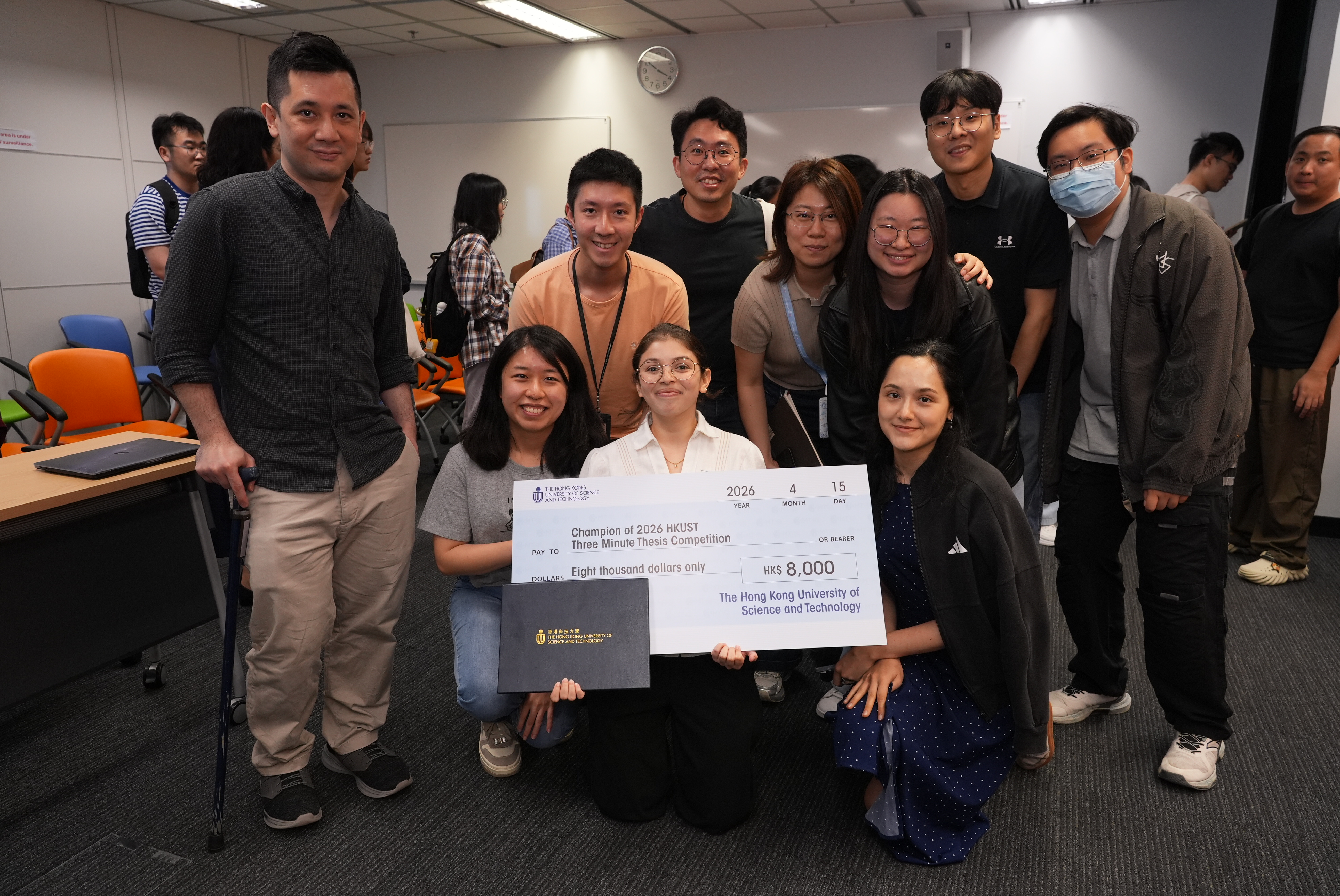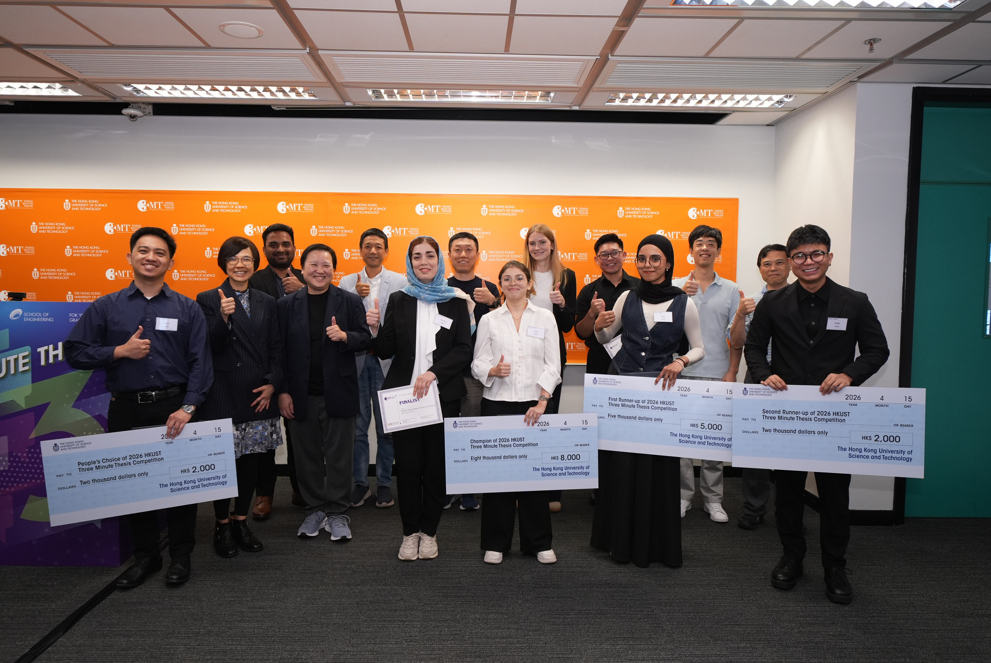 The 2026 HKUST Three Minute Thesis (3MT®) Competition attracted entries from thirteen disciplines and representing twelve economies. After four days' pre-selection interviews, eight candidates from four schools and with six nationalities were selected for the final round that was held on April 15, 2026. At the final round all the finalists presented their enthusiasm for research and introduced their work with cheerful spirit and stimulating style. The judges evaluated the finalists' 3MT® presentations as well as their performance during the Q&A session. Vrinda Mathur, PhD student in the Division of Life Science, won the Championship. She will also represent the HKUST at the 2026 Asia-Pacific 3MT® Competition. The 1st Runner-up and the 2nd Runner-up went to Eman Ansar, MPhil student in the Department of Computer Science and Engineering, and Giorgio Armand Manzanilla Robel, PhD student in the Department of Civil and Environmental Engineering. Francis Eric Patricio Almaquer won the People's Choice Award.