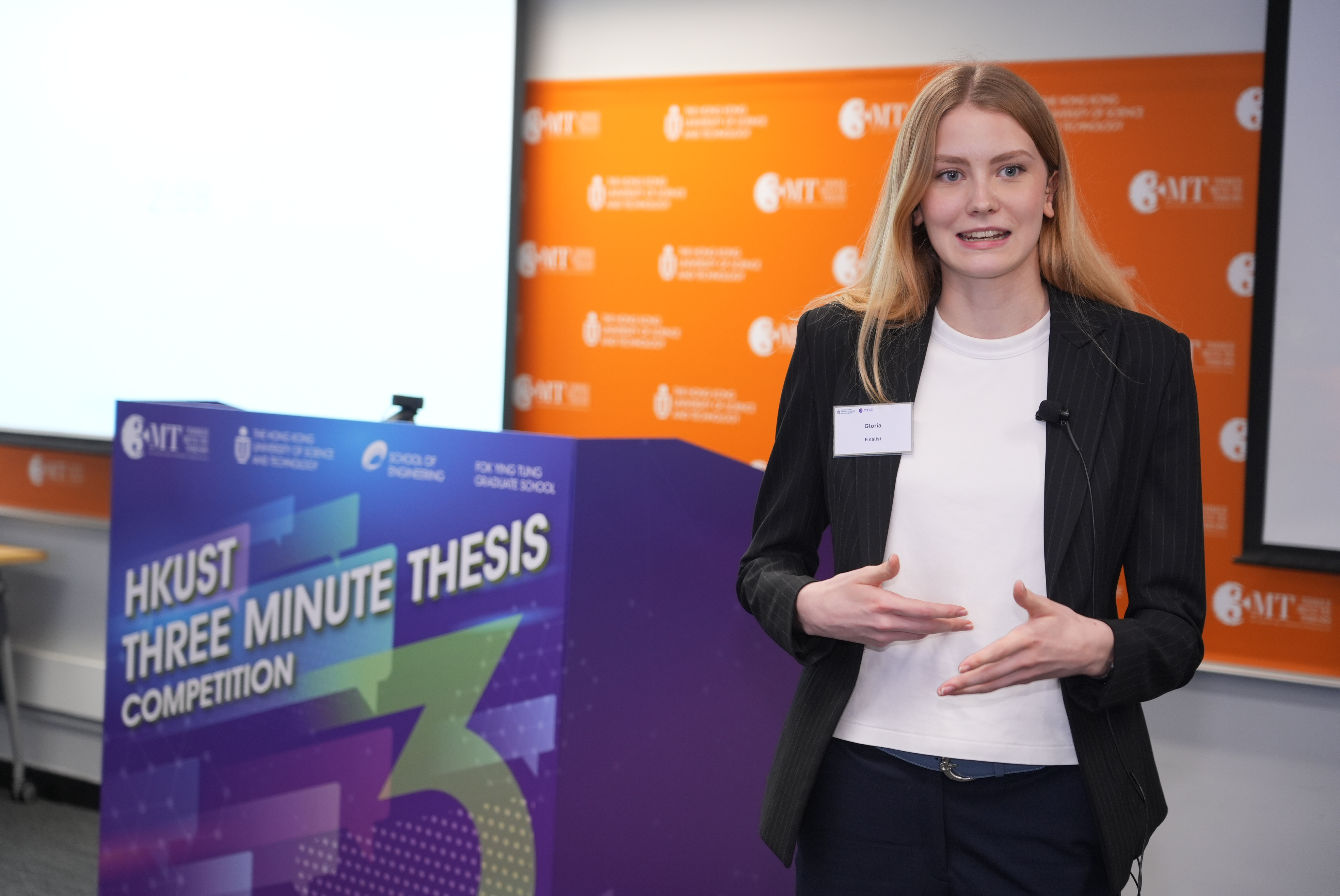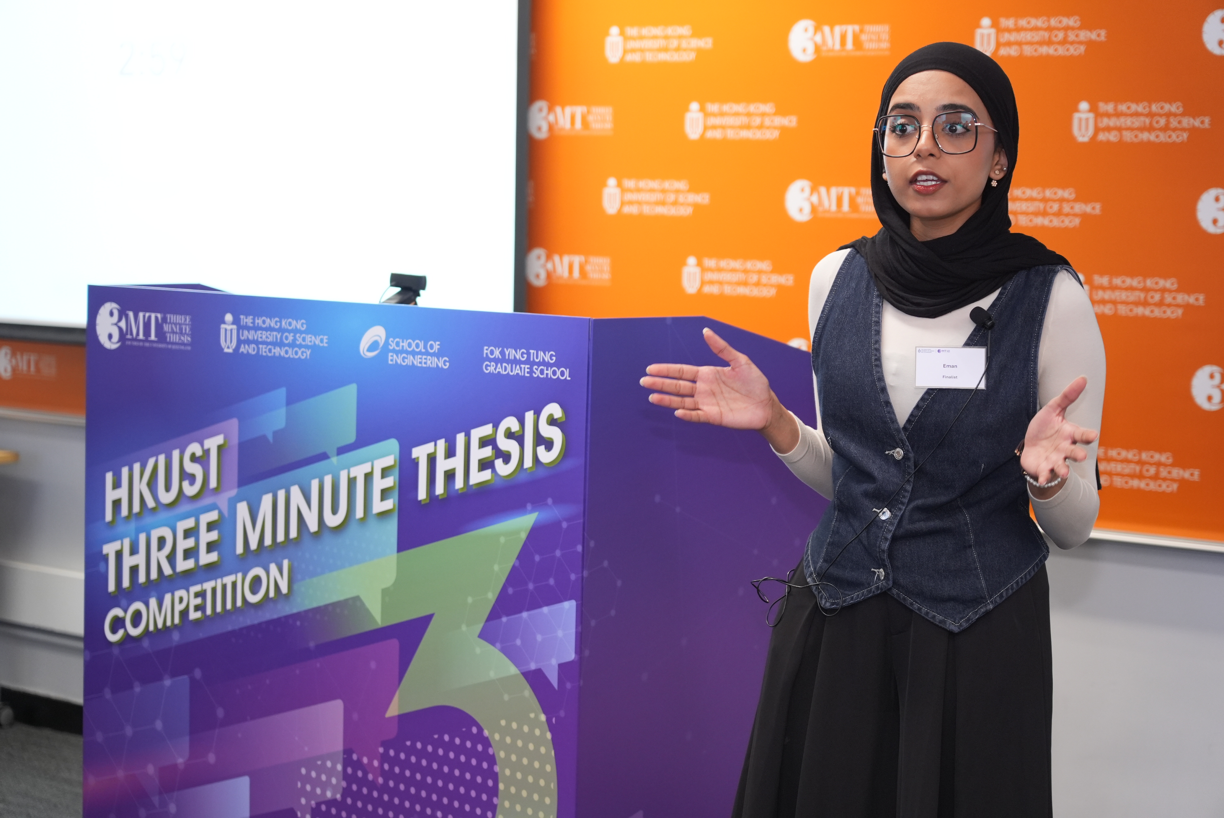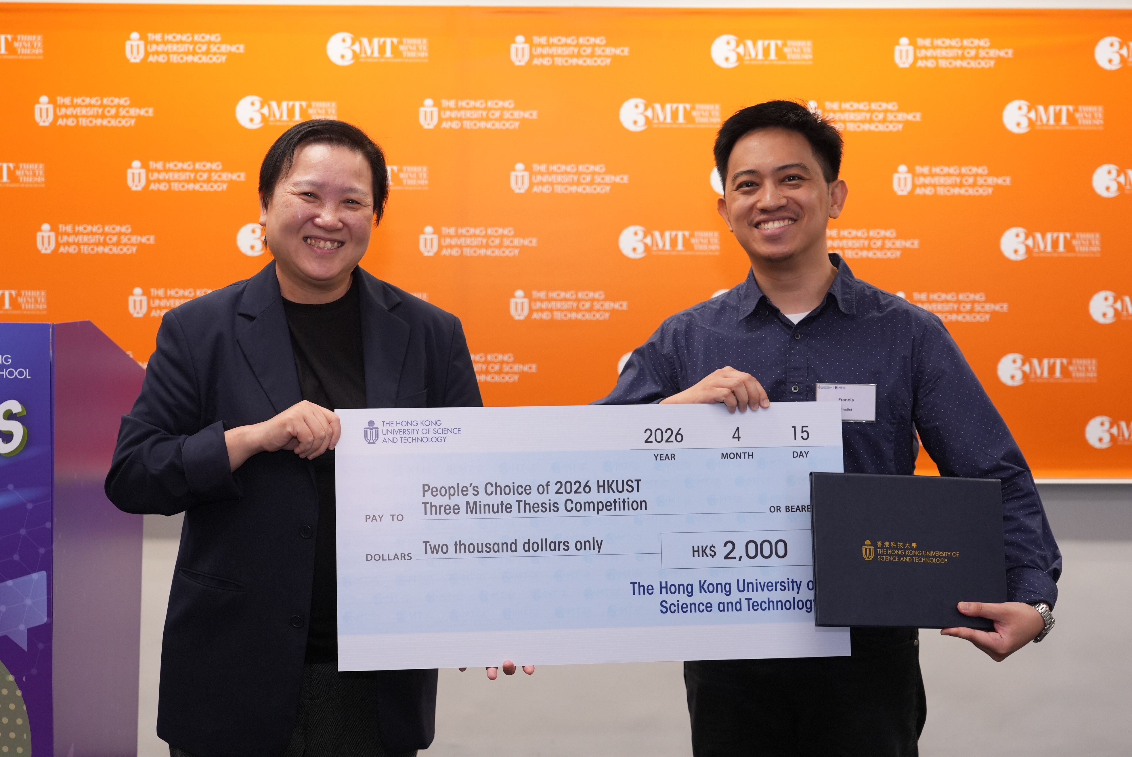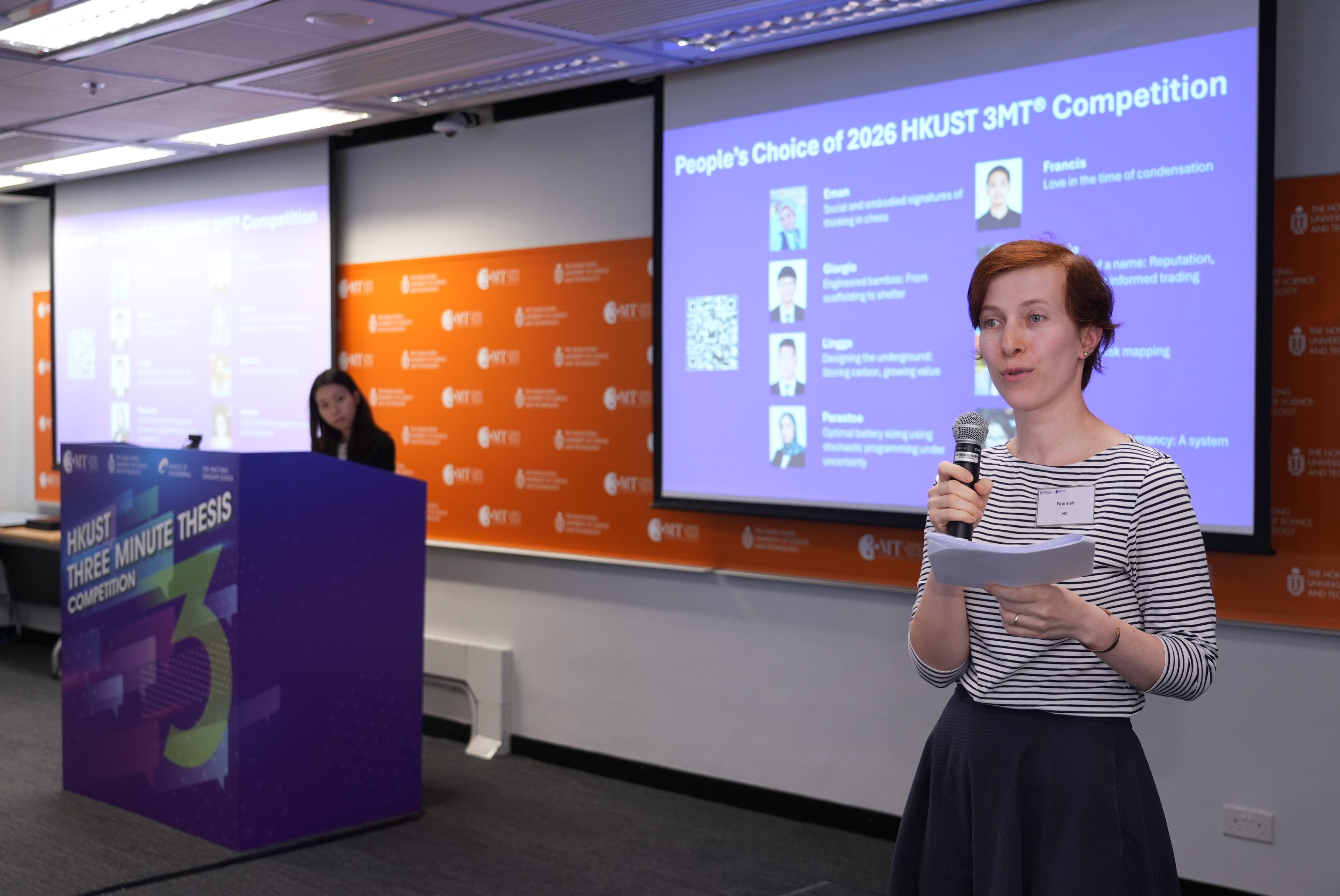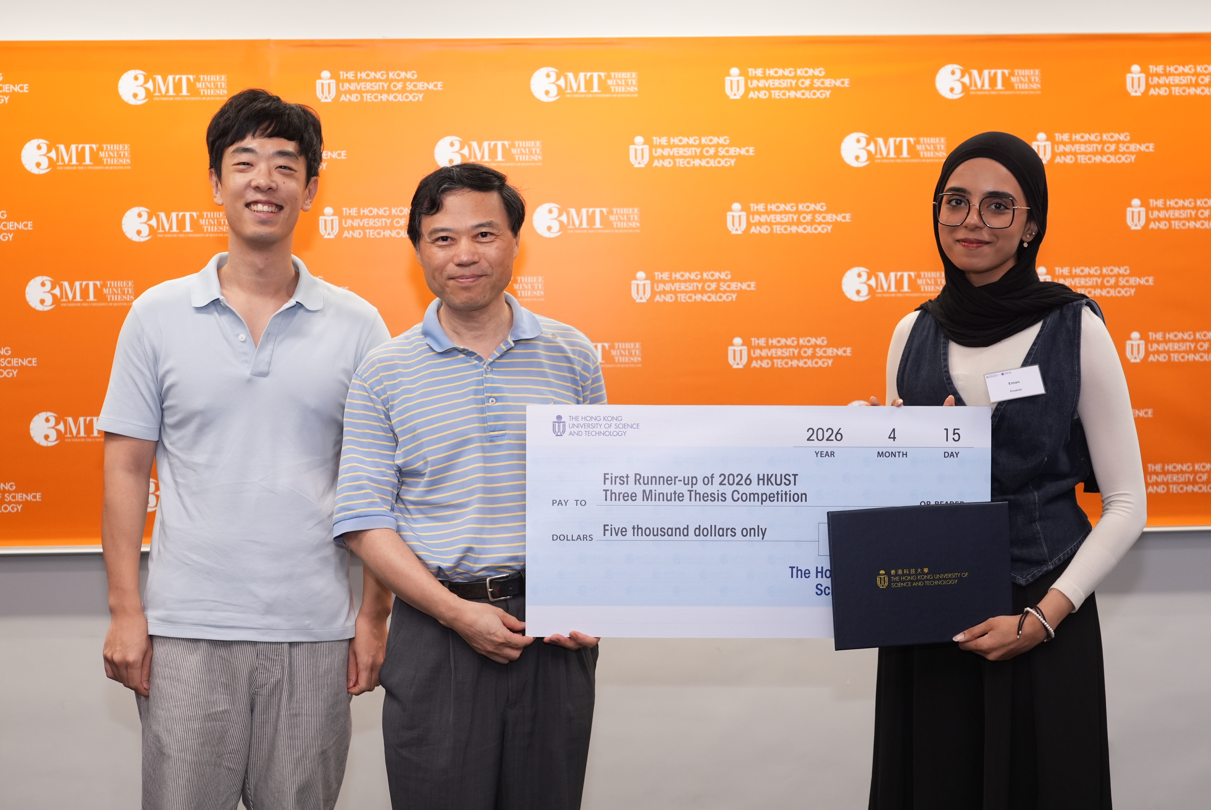 The 2026 HKUST Three Minute Thesis (3MT®) Competition attracted entries from thirteen disciplines and representing twelve economies. After four days' pre-selection interviews, eight candidates from four schools and with six nationalities were selected for the final round that was held on April 15, 2026. At the final round all the finalists presented their enthusiasm for research and introduced their work with cheerful spirit and stimulating style. The judges evaluated the finalists' 3MT® presentations as well as their performance during the Q&A session. Vrinda Mathur, PhD student in the Division of Life Science, won the Championship. She will also represent the HKUST at the 2026 Asia-Pacific 3MT® Competition. The 1st Runner-up and the 2nd Runner-up went to Eman Ansar, MPhil student in the Department of Computer Science and Engineering, and Giorgio Armand Manzanilla Robel, PhD student in the Department of Civil and Environmental Engineering. Francis Eric Patricio Almaquer won the People's Choice Award.